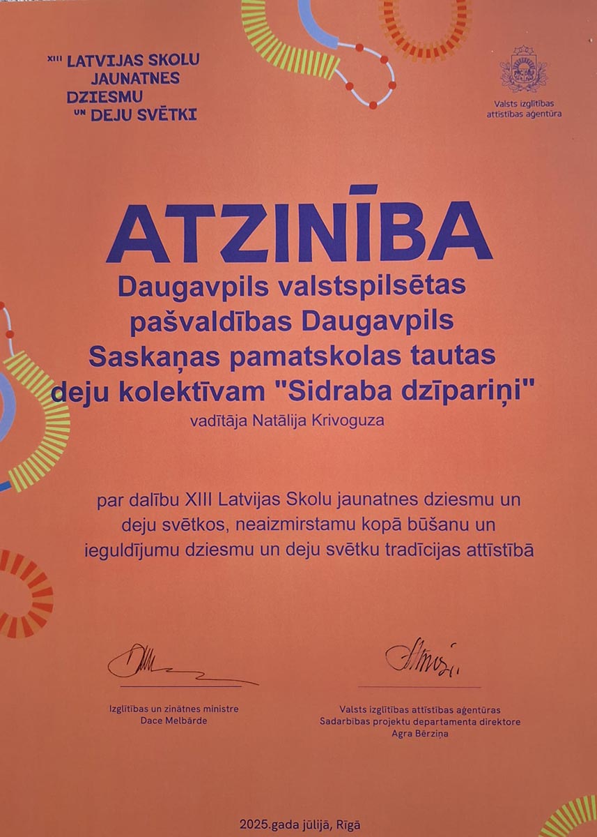 Daugavpils Saskaņas pamatskolas tautas deju kolektīvs “Sidraba dzīpariņi” saņēma Atzinības rakstu par piedalīšanos Latvijas skolu jaunatnes dziesmu un deju svētkos.