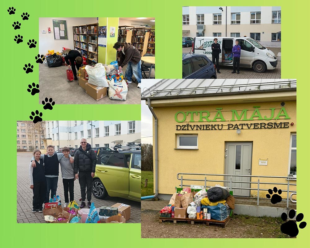 Skolas kopiena sagādāja ziedojumus divām dzīvnieku patversmēm – biedrībai “Astes un Ķepas” un patversmei “Otrā māja”. Ziedojumos bija barība, segas, rotaļlietas un citas lietas, kas patversmēs noderēs ziemas laikā. Katrs dāvātais priekšmets nozīmē daudz – tajā ir sirds siltums un līdzcietība pret mūsu mazajiem draugiem.