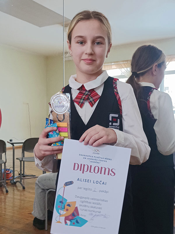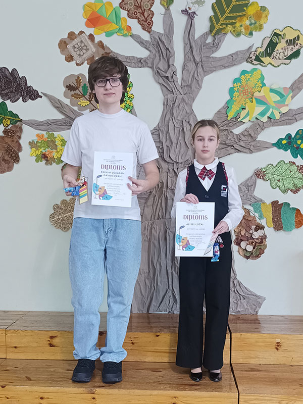 Apsveicam un ar prieku paziņojam, ka 2.- 3. klašu grupā Rolands Dudevičs ieguva 1.pakāpi (skolotāja Sandra Dimante); 4. – 6. klašu grupā Alise Loča ieguva 2.pakāpi (skolotāja Lolita Valaine-Aizbalte) un Demids Osītis ieguva 1.pakāpi (skolotāja Vija Kursīte); 7.-9. klašu grupā Reinis Lūkass Davidčuks ieguva augstāko pakāpi (skolotāja Svetlana Polkovņikova).