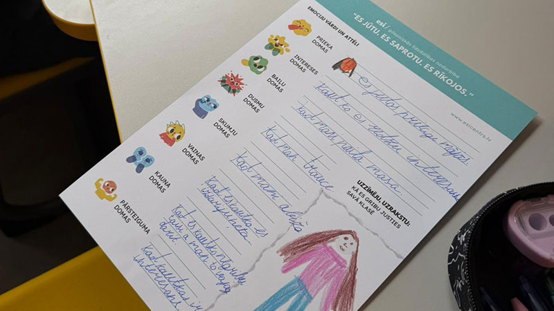 Skolēnu domas par nodarbību. Justīnei interesanti šķita, ka var aprakstīt katrai emocijai savu dzīves situāciju. Aleksam patika aktīvās kustības, attēlojot emociju veidus. Alise: "Man ļoti patika, ka mēs atkārtojām emocijas, kustējāmies un pildījām nelielu uzdevumu. Bija interesanti pētīt, kā emocijas var izpausties dažādos veidos. Nodarbība bija jautra un man palika priecīgs noskaņojums." Evans: "Nodarbība bija ļoti smieklīga un aizraujoša. Bija interesanti atdarināt dažādas sejas izteiksmes. Man īpaši patika mācīties elpošanas vingrinājumus, kas palīdz justies labāk."